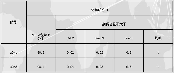 牌號化學成份 %AL2O3含量不小于雜質(zhì)含量不大于SiO2Fe2O3Na2O灼堿AO-198.60.020.020.51AO-298.40.040.030.61